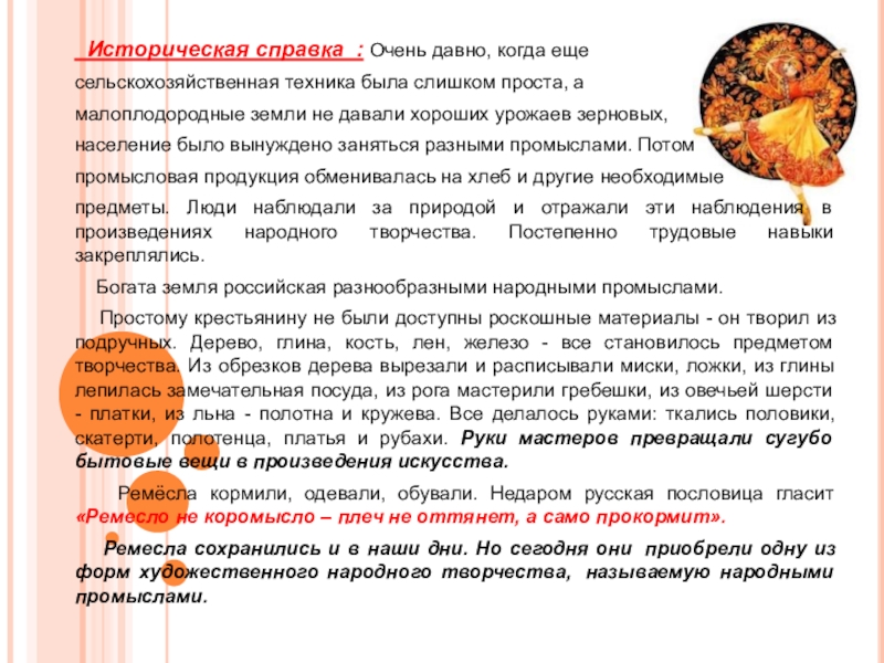 Наши предки испокон веков славились добрыми мастерами, людьми, которые создавали своими руками сказочную красоту. Занимаясь разными ремеслами, люди зарабатывали себе на хлеб насущный.