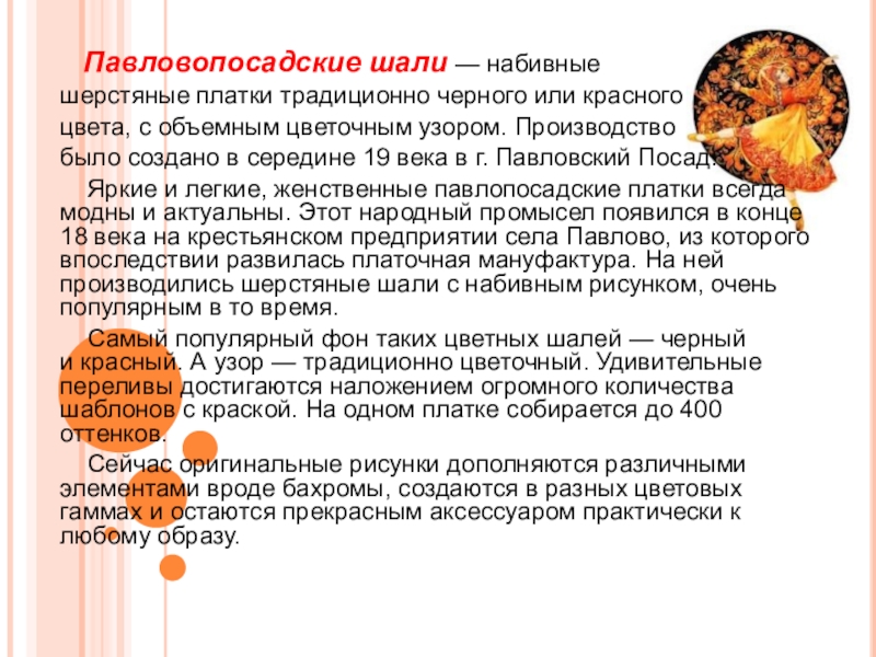 Яркие и легкие, женственные павлопосадские платки всегда модны и актуальны. Этот народный промысел появился в конце 18 века на крестьянском предприятии села Павлово, из которого впоследствии развилась платочная мануфактура. На ней производились шерстяные шали с набивным рисунком, очень популярным в то время.