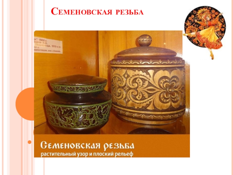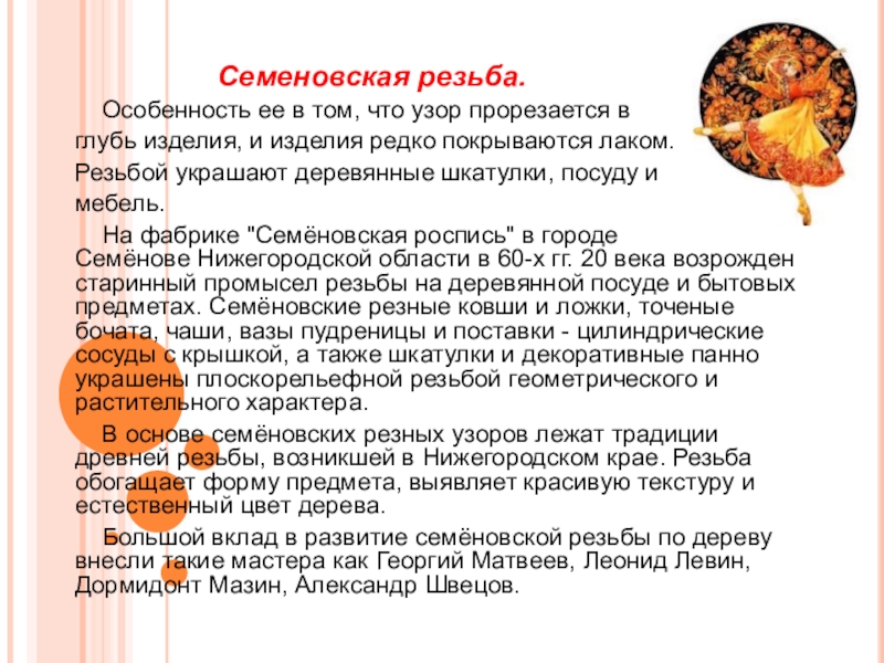 В основе семёновских резных узоров лежат традиции древней резьбы, возникшей в Нижегородском крае. Резьба обогащает форму предмета, выявляет красивую текстуру и естественный цвет дерева.