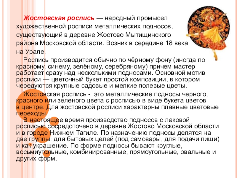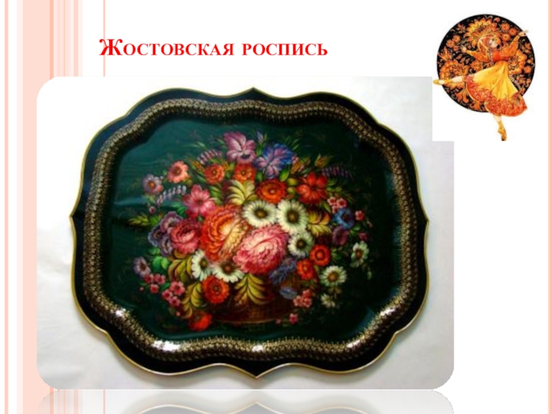 Жостовская роспись - это металлические подносы черного, красного или зеленого цвета с росписью в виде букета цветов в центре. Для жостовской росписи характерны плавные цветовые переходы.