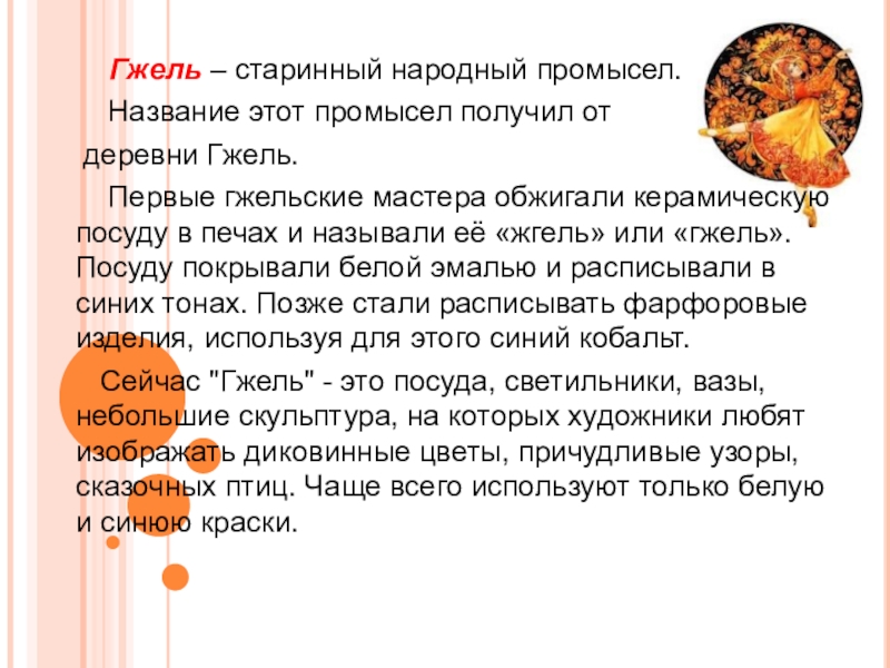 Первые гжельские мастера обжигали керамическую посуду в печах и называли её «жгель» или «гжель». Посуду покрывали белой эмалью и расписывали в синих тонах. Позже стали расписывать фарфоровые изделия, используя для этого синий кобальт.