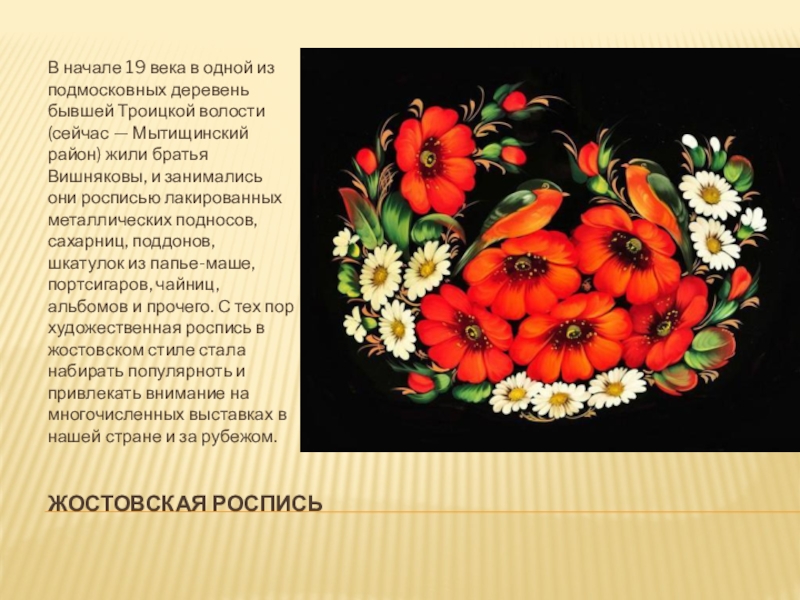 Троицкой волости (сейчас — Мытищинский район) жили братья Вишняковы, и занимались они росписью лакированных металлических подносов, сахарниц, поддонов, шкатулок из папье-маше, портсигаров, чайниц, альбомов и прочего. С тех пор художественная роспись в жостовском стиле стала набирать популярноть и привлекать внимание на многочисленных выставках в нашей стране и за рубежом.