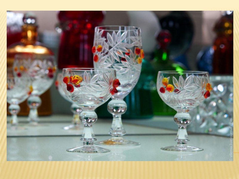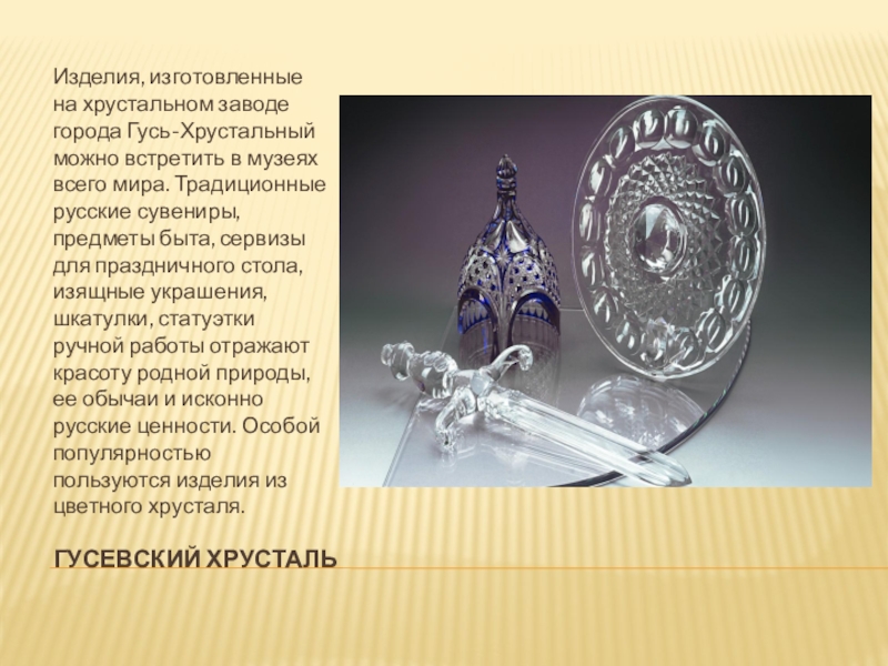 музеях всего мира. Традиционные русские сувениры, предметы быта, сервизы для праздничного стола, изящные украшения, шкатулки, статуэтки ручной работы отражают красоту родной природы, ее обычаи и исконно русские ценности. Особой популярностью пользуются изделия из цветного хрусталя.