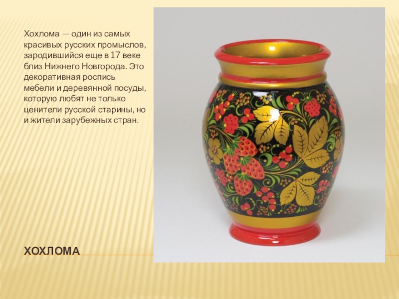 Хохлома — один из самых красивых русских промыслов, зародившийся еще в