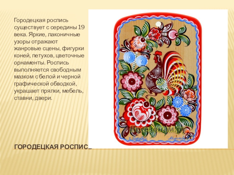 Городецкая роспись существует с середины 19 века. Яркие, лаконичные узоры