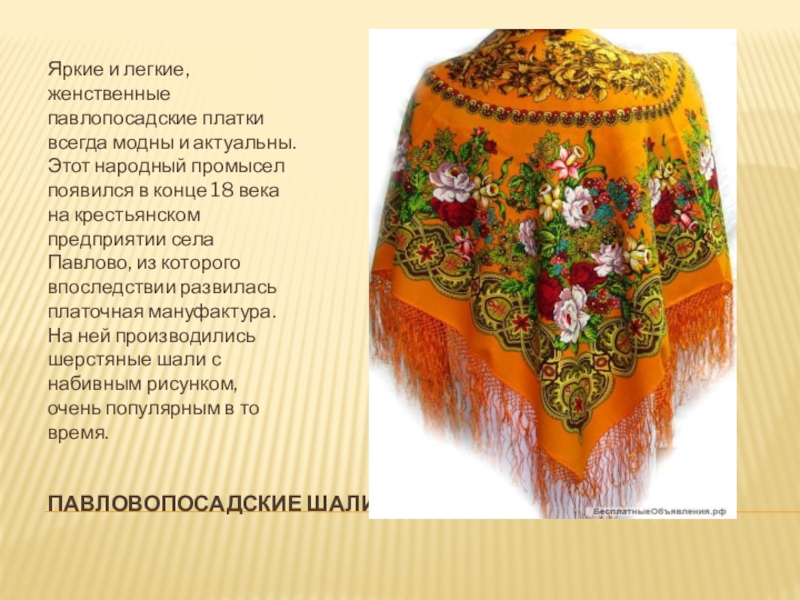 Этот народный промысел появился в конце 18 века на крестьянском предприятии села Павлово, из которого впоследствии развилась платочная мануфактура. На ней производились шерстяные шали с набивным рисунком, очень популярным в то время.