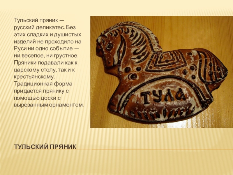 изделий не проходило на Руси ни одно событие — ни веселое, ни грустное. Пряники подавали как к царскому столу, так и к крестьянскому. Традиционная форма придается прянику с помощью доски с вырезанным орнаментом.