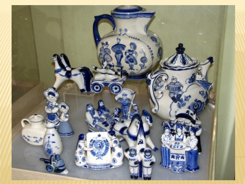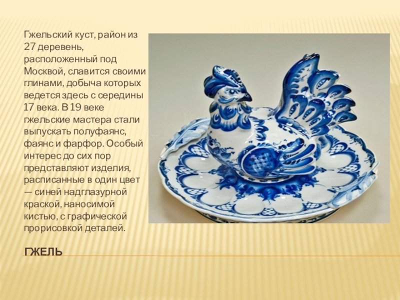 глинами, добыча которых ведется здесь с середины 17 века. В 19 веке гжельские мастера стали выпускать полуфаянс, фаянс и фарфор. Особый интерес до сих пор представляют изделия, расписанные в один цвет — синей надглазурной краской, наносимой кистью, с графической прорисовкой деталей.