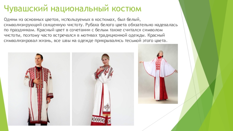 символизирующий священную чистоту. Рубаха белого цвета обязательно надевалась по праздникам. Красный цвет в сочетании с белым также считался символом чистоты, поэтому часто встречался в мотивах традиционной одежды. Красный символизировал жизнь, все швы на одежде прикрывались тесьмой этого цвета.