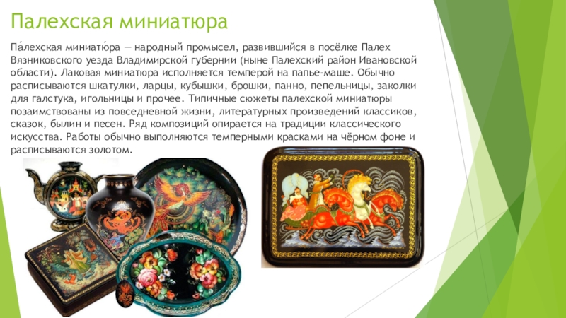 уезда Владимирской губернии (ныне Палехский район Ивановской области). Лаковая миниатюра исполняется темперой на папье-маше. Обычно расписываются шкатулки, ларцы, кубышки, брошки, панно, пепельницы, заколки для галстука, игольницы и прочее. Типичные сюжеты палехской миниатюры позаимствованы из повседневной жизни, литературных произведений классиков, сказок, былин и песен. Ряд композиций опирается на традиции классического искусства. Работы обычно выполняются темперными красками на чёрном фоне и расписываются золотом.