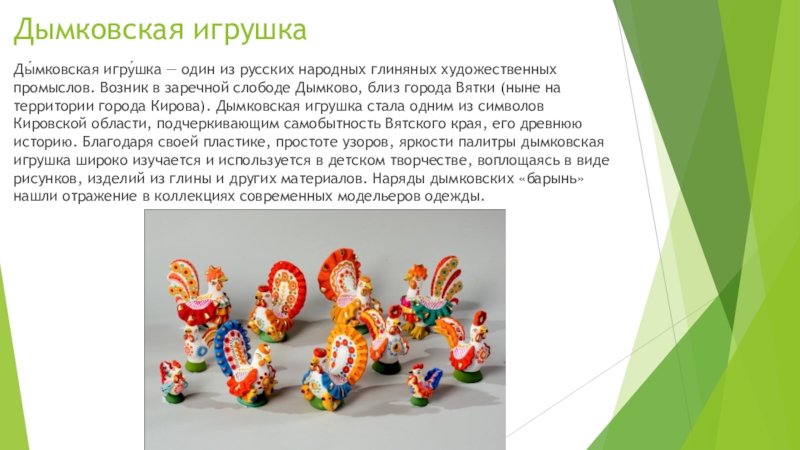 Возник в заречной слободе Дымково, близ города Вятки (ныне на территории города Кирова). Дымковская игрушка стала одним из символов Кировской области, подчеркивающим самобытность Вятского края, его древнюю историю. Благодаря своей пластике, простоте узоров, яркости палитры дымковская игрушка широко изучается и используется в детском творчестве, воплощаясь в виде рисунков, изделий из глины и других материалов. Наряды дымковских «барынь» нашли отражение в коллекциях современных модельеров одежды.