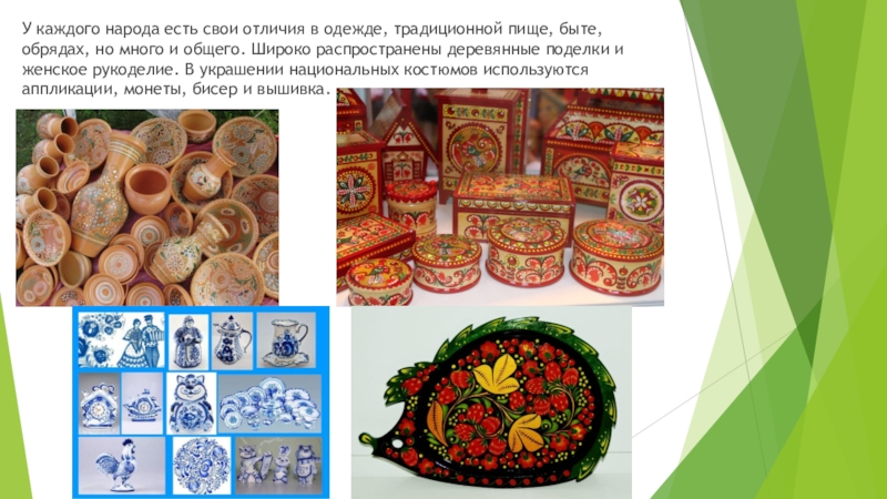 быте, обрядах, но много и общего. Широко распространены деревянные поделки и женское рукоделие. В украшении национальных костюмов используются аппликации, монеты, бисер и вышивка.