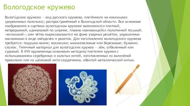 палочках); распространённый в Вологодской области. Все основные изображения в сцепном вологодском кружеве выполняются плотной, непрерывной, одинаковой по ширине, плавно извивающейся полотняной тесьмой, «вилюшкой»; они чётко вырисовываются на фоне узорных решёток, украшенных насновками в виде звёздочек и розеток. Для изготовления вологодского кружева требуется: подушка-валик; коклюшки; можжевеловые или березовые; булавки; сколок. Типичный материал для вологодских кружев — лён, отбеленный или суровый. В XVII кружевницы осваивали методику плетения кружев с использованием серебряных и золотых нитей, изготовленных из волочёной проволоки или из шёлковой нити-сердечника, обвитой металлической нитью.