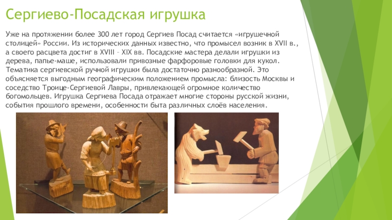 «игрушечной столицей» России. Из исторических данных известно, что промысел возник в XVII в., а своего расцвета достиг в XVIII – XIX вв. Посадские мастера делали игрушки из дерева, папье-маше, использовали привозные фарфоровые головки для кукол. Тематика сергиевской ручной игрушки была достаточно разнообразной. Это объясняется выгодным географическим положением промысла: близость Москвы и соседство Троице-Сергиевой Лавры, привлекающей огромное количество богомольцев. Игрушка Сергиева Посада отражает многие стороны русской жизни, события прошлого времени, особенности быта различных слоёв населения.
