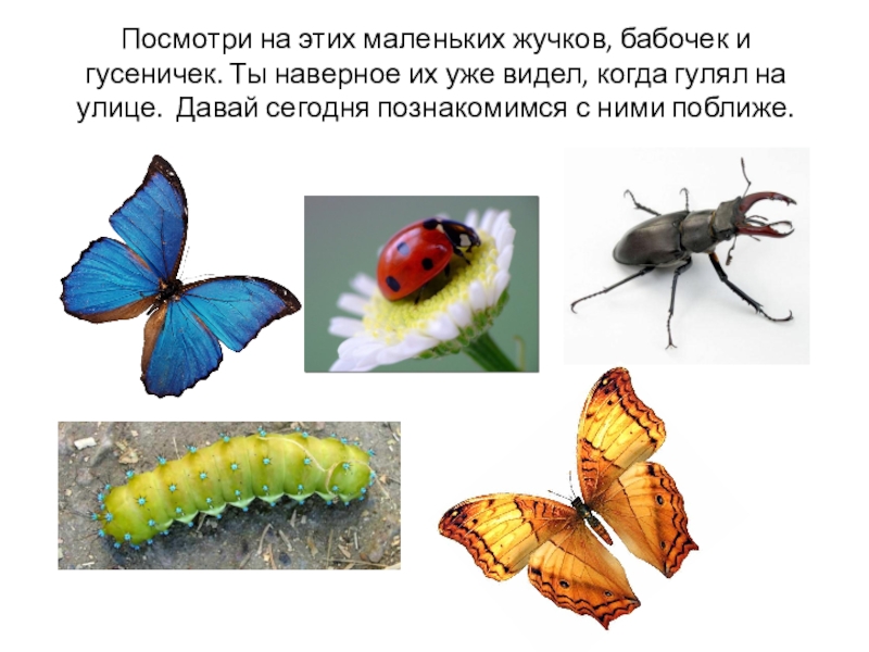 Слайд 2Посмотри на этих маленьких жучков, бабочек и гусеничек. Ты наверное их