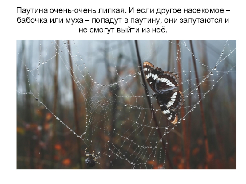 Слайд 42Паутина очень-очень липкая. И если другое насекомое – бабочка или муха