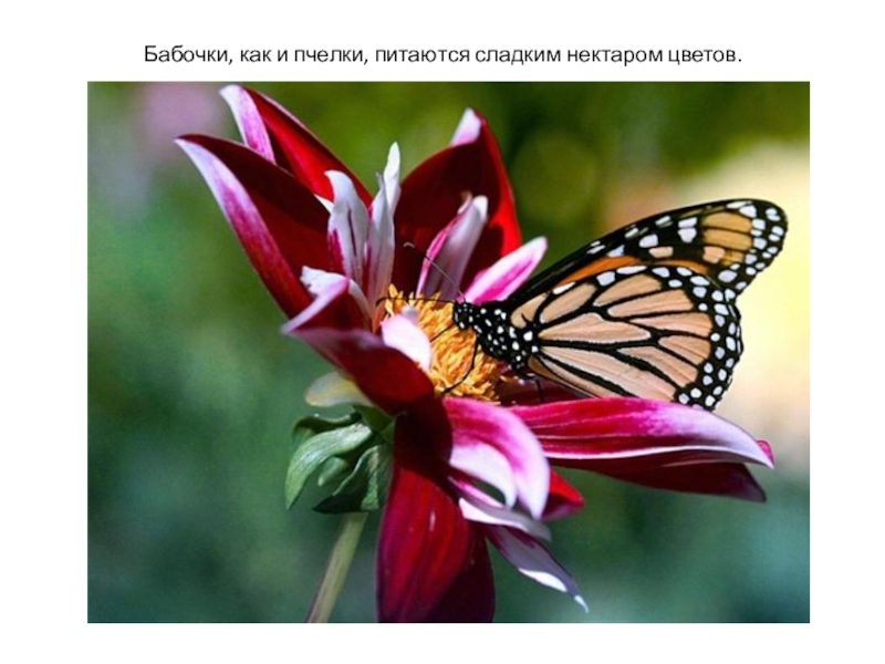 Слайд 29Бабочки, как и пчелки, питаются сладким нектаром цветов.