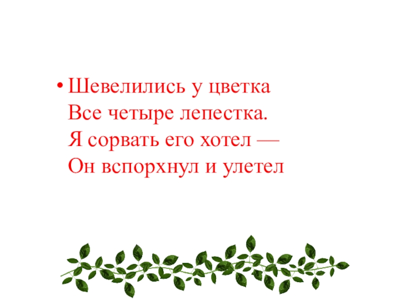 Слайд 27Шевелились у цветка Все четыре лепестка. Я сорвать его хотел — Он вспорхнул и