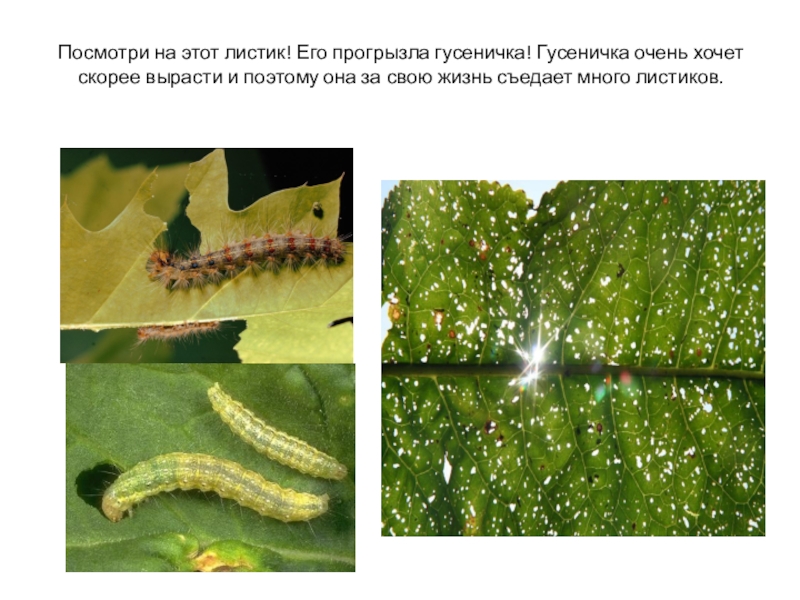 Слайд 33Посмотри на этот листик! Его прогрызла гусеничка! Гусеничка очень хочет скорее