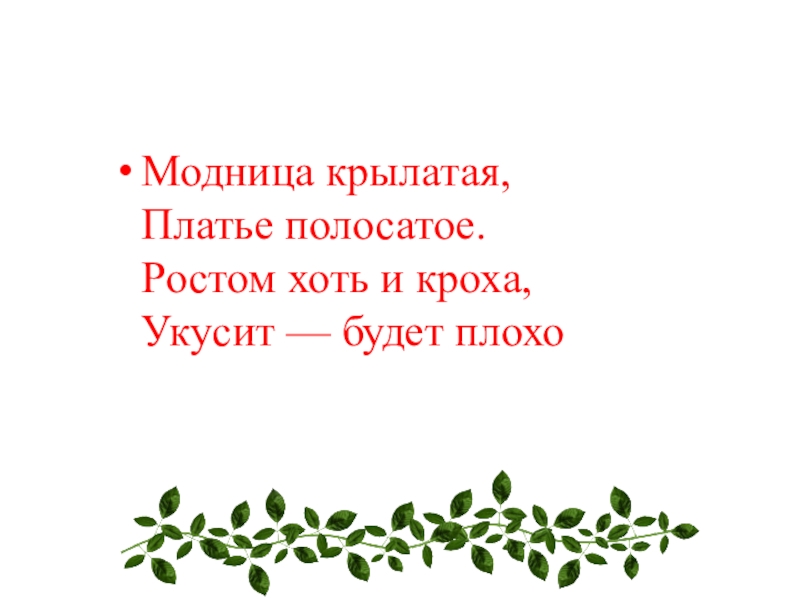 Слайд 17Модница крылатая, Платье полосатое. Ростом хоть и кроха, Укусит — будет плохо