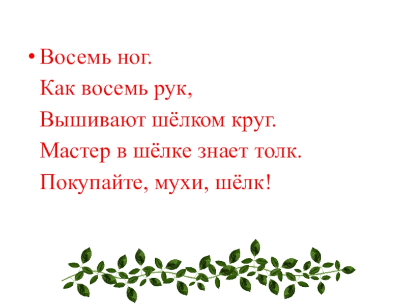 Слайд 39Восемь ног. Как восемь рук, Вышивают шёлком круг. Мастер в шёлке знает толк. Покупайте, мухи,