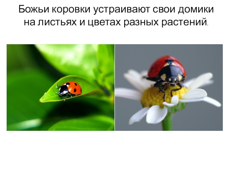 Слайд 6Божьи коровки устраивают свои домики на листьях и цветах разных растений.