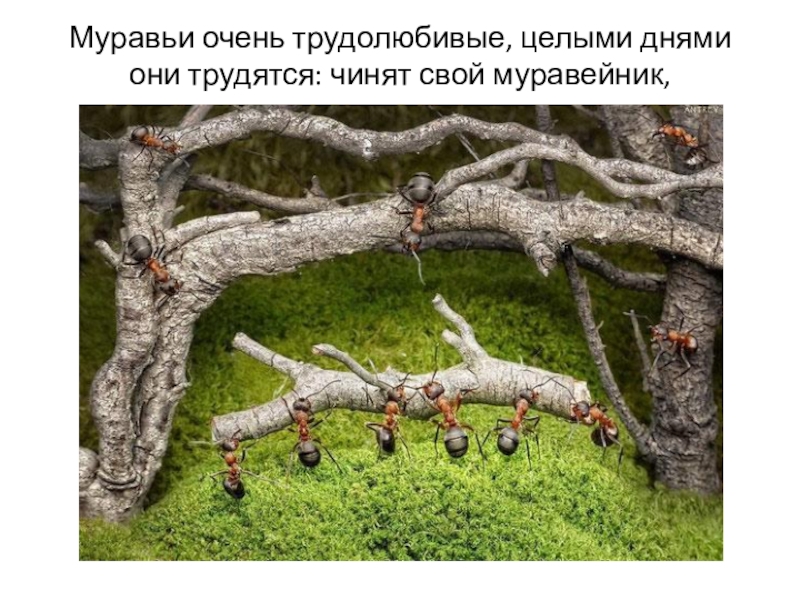 Слайд 14Муравьи очень трудолюбивые, целыми днями они трудятся: чинят свой муравейник,