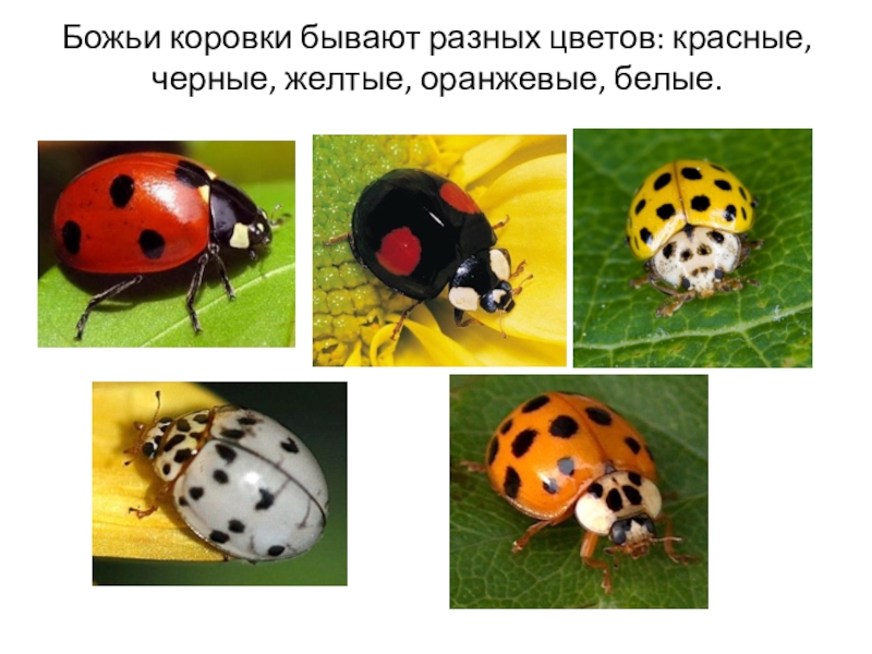 Слайд 5Божьи коровки бывают разных цветов: красные, черные, желтые, оранжевые, белые.