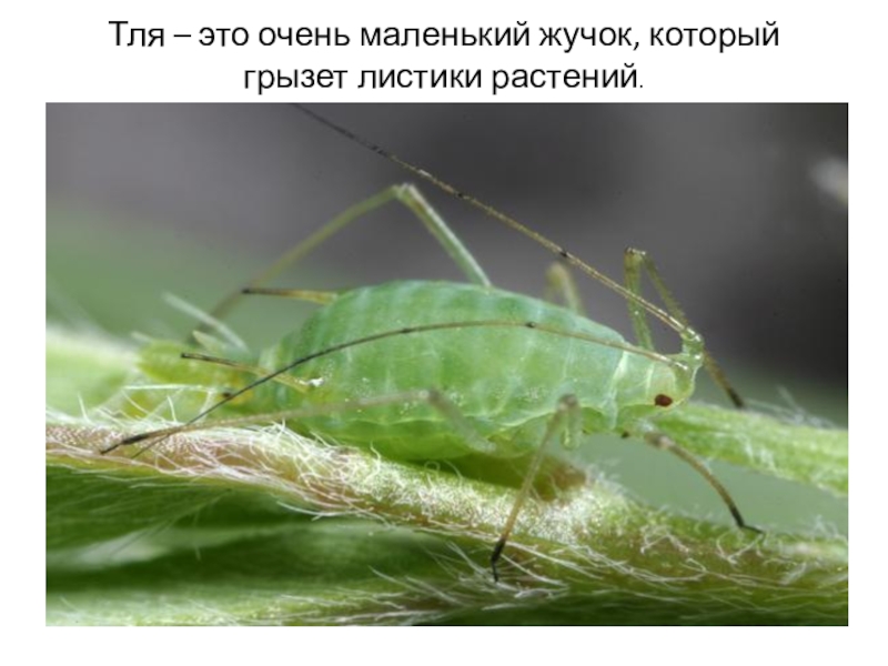 Слайд 9Тля – это очень маленький жучок, который грызет листики растений.