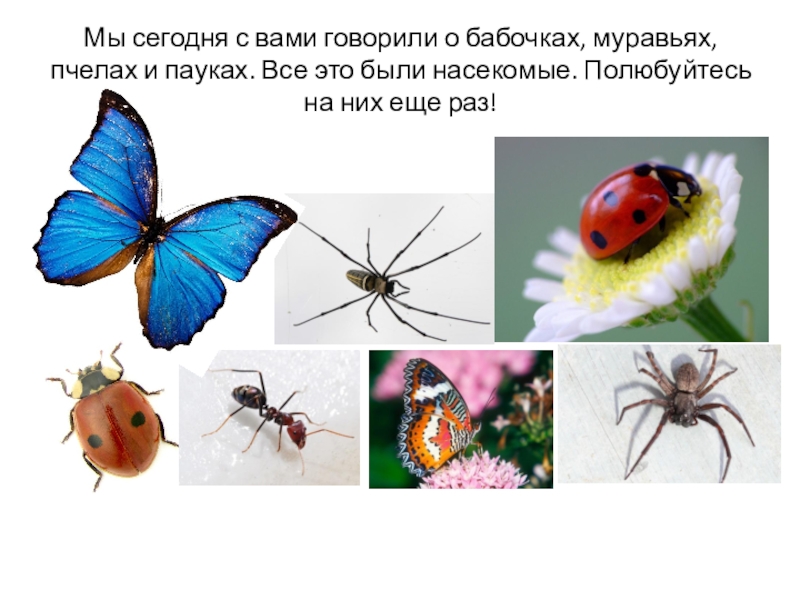 Мы сегодня с вами говорили о бабочках, муравьях, пчелах и пауках. Все это были насекомые. Полюбуйтесь на