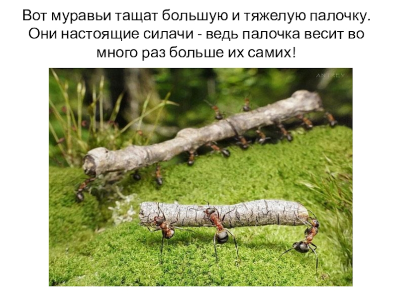 Слайд 16Вот муравьи тащат большую и тяжелую палочку. Они настоящие силачи -