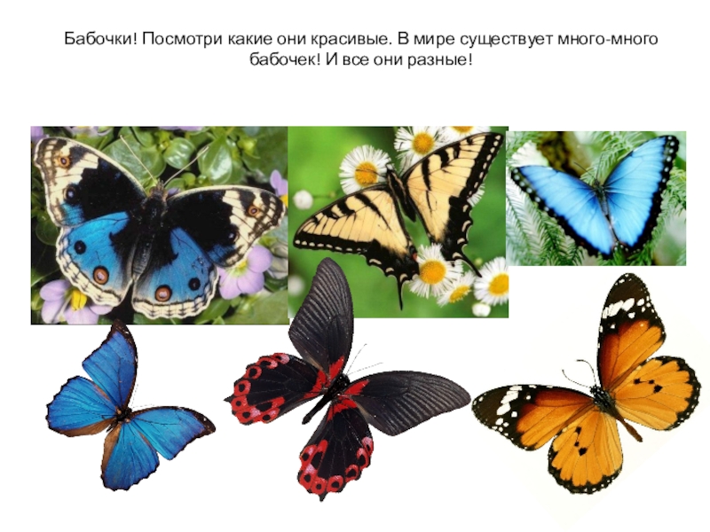 Слайд 28Бабочки! Посмотри какие они красивые. В мире существует много-много бабочек! И