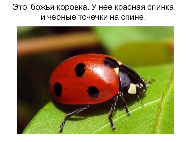 Слайд 4Это божья коровка. У нее красная спинка и черные точечки на