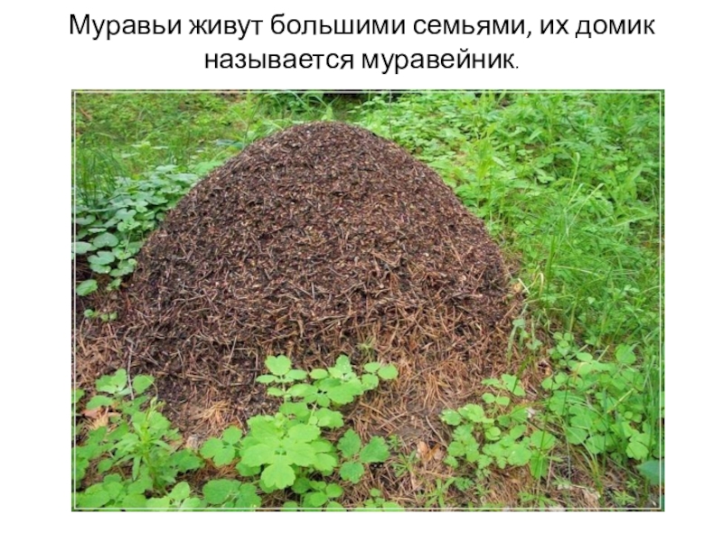 Слайд 13Муравьи живут большими семьями, их домик называется муравейник.