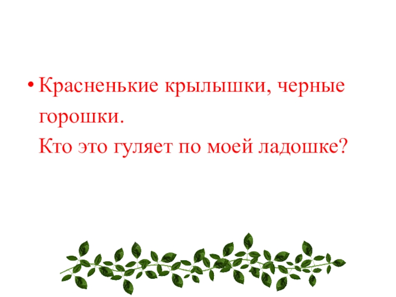Слайд 3Красненькие крылышки, черные горошки. Кто это гуляет по моей ладошке?