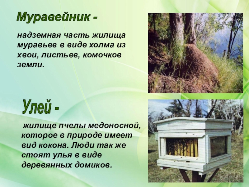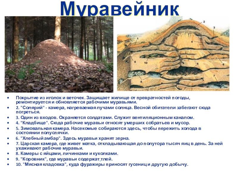 надземная часть жилища муравьев в виде холма из хвои, листьев, комочков земли.