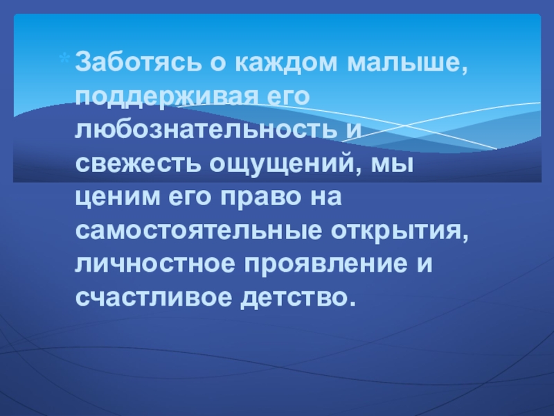 Слайд 46Заботясь о каждом малыше, поддерживая его любознательность и свежесть ощущений, мы