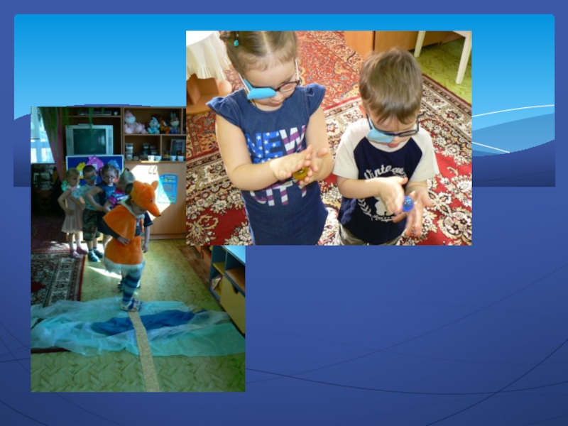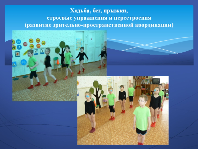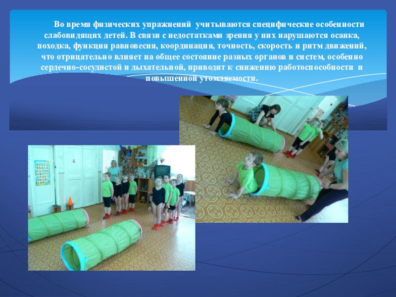 Слайд 23Во время физических упражнений учитываются специфические особенности слабовидящих детей. В связи