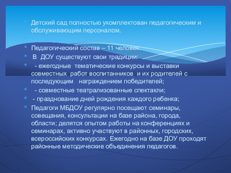 Слайд 4Детский сад полностью укомплектован педагогическим и обслуживающим персоналом.