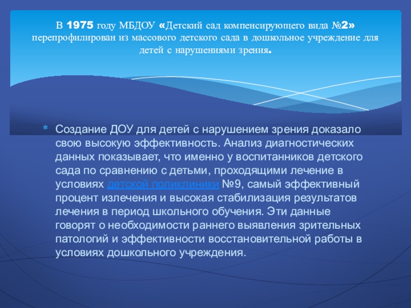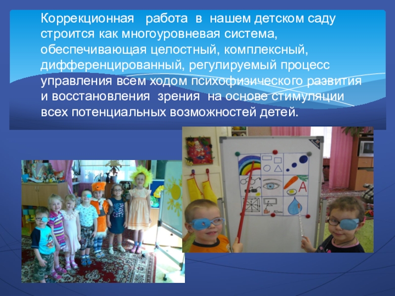 Слайд 5Создание ДОУ для детей с нарушением зрения доказало свою высокую эффективность.