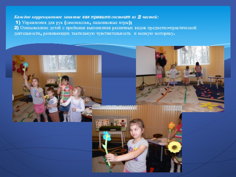 для рук (самомассаж, пальчиковые игры); 2) Ознакомление детей с приёмами выполнения различных видов предметно-практической деятельности, развивающих тактильную чувствительность и мелкую моторику.