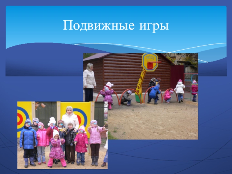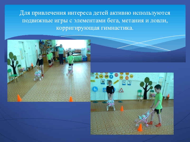 Слайд 25Для привлечения интереса детей активно используются подвижные игры с элементами бега,