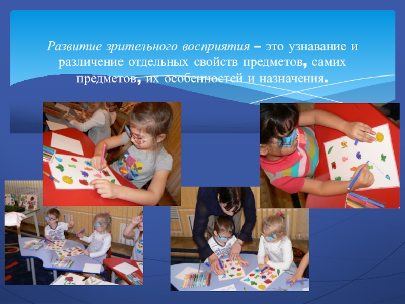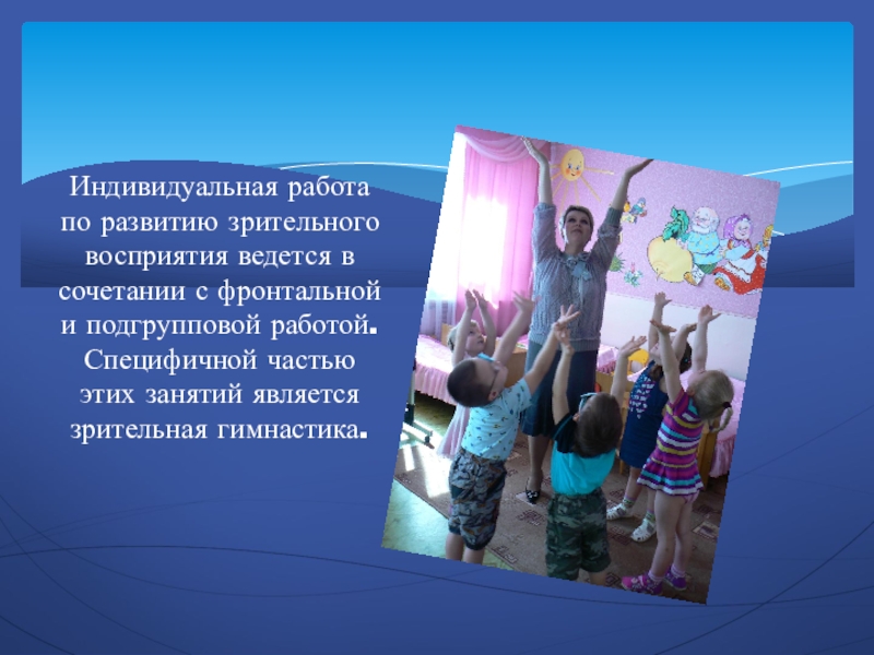 Слайд 30Индивидуальная работа по развитию зрительного восприятия ведется в сочетании с фронтальной