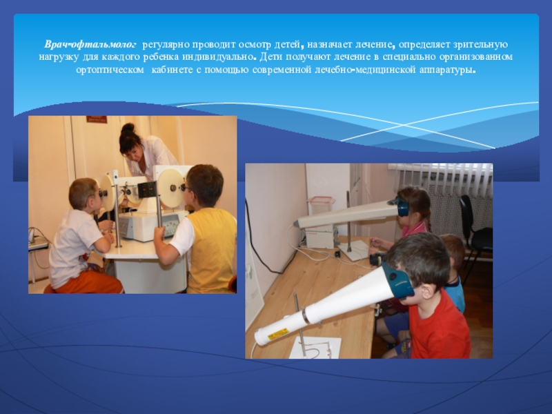 Врач-офтальмолог регулярно проводит осмотр детей, назначает лечение, определяет зрительную нагрузку для