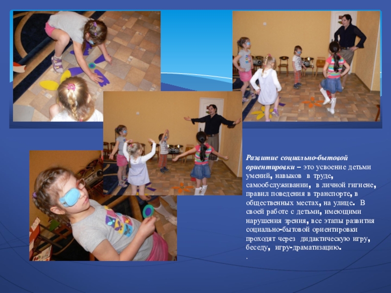 самообслуживании, в личной гигиене, правил поведения в транспорте, в общественных местах, на улице. В своей работе с детьми, имеющими нарушения зрения, все этапы развития социально-бытовой ориентировки проходят через дидактическую игру, беседу, игру-драматизацию.