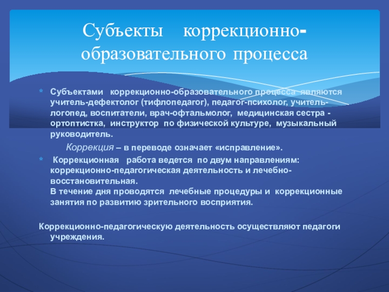 Слайд 8Субъектами коррекционно-образовательного процесса являются учитель-дефектолог (тифлопедагог), педагог-психолог, учитель-логопед, воспитатели, врач-офтальмолог,