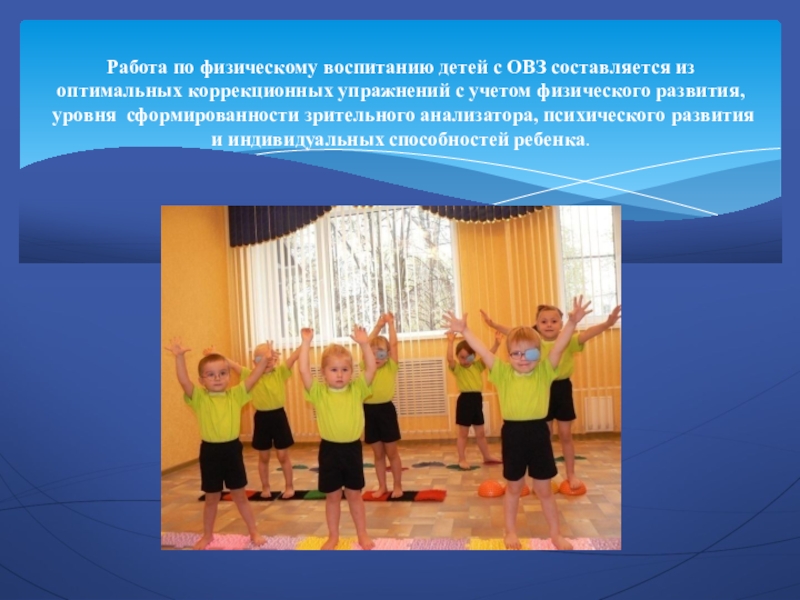 Слайд 16Работа по физическому воспитанию детей с ОВЗ составляется из оптимальных коррекционных