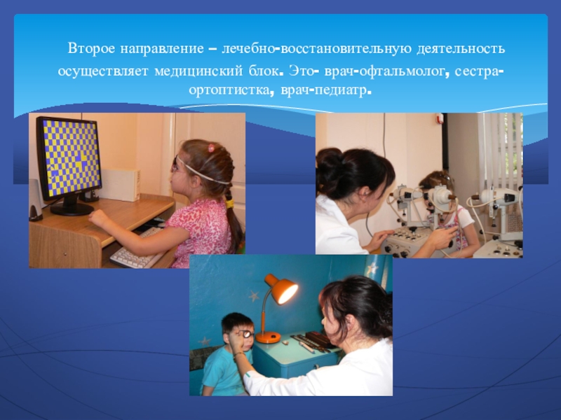 Слайд 44 Второе направление – лечебно-восстановительную деятельность осуществляет медицинский блок. Это- врач-офтальмолог,