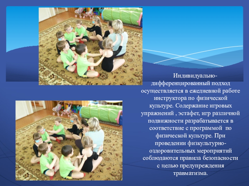 Слайд 28Индивидуально-дифференцированный подход осуществляется в ежедневной работе инструктора по физической культуре. Содержание