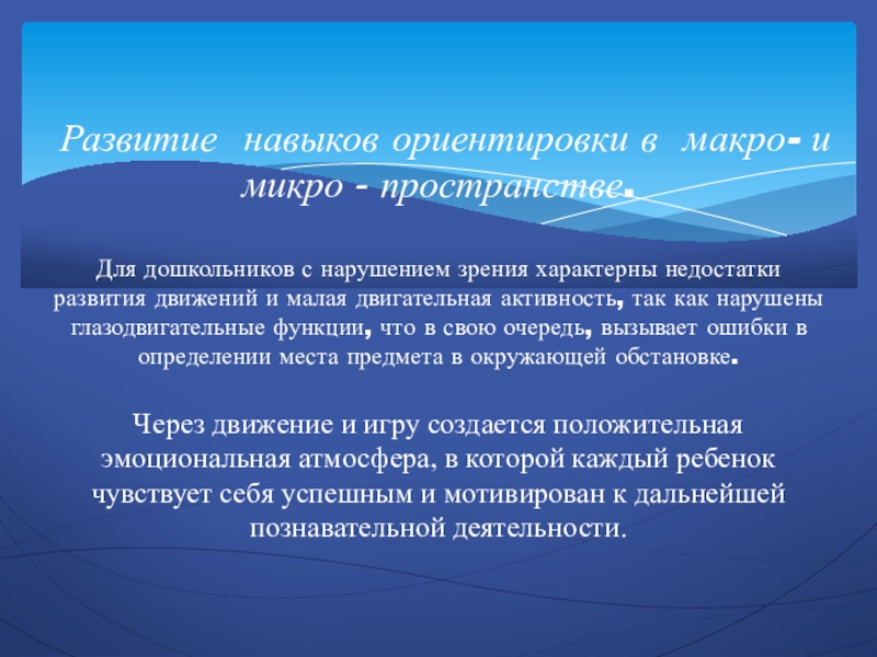 с нарушением зрения характерны недостатки развития движений и малая двигательная активность, так как нарушены глазодвигательные функции, что в свою очередь, вызывает ошибки в определении места предмета в окружающей обстановке.